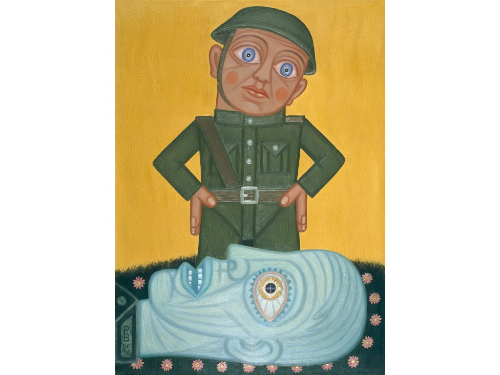 Jestli by nebyl a nestřílel by, když k tomu dostal povel, střelil by ho asi nějaký politruk do zad, a to důvodně. Armáda je k tomu, aby poslouchala a zabíjela. A přesto, když se tady ten Vojáček s hlavou udiveně nakloněnou zastavil na bojišti a stanul nad mrtvým Nepřítelem se ztuhlýma očima, které se nepřestávají dívat, jsou i ty jeho oči užaslé a trochu začervenalé, jako by ho pálily nebo jako by měly sklon slzet. I velká mrtvá hlava působí udiveně tím, že je mrtvá a narůstá do vyčítavé podoby uprostřed rozkvetlé louky. A ten v podstatě asi docela hodný a nevinný Vojáček se nestačí vynadivit tomu, co to vlastně provedl a co je to ta smrt.